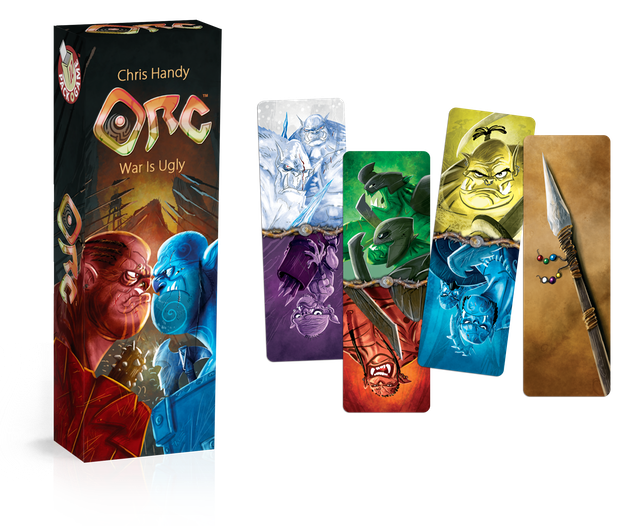 ORC is a Lost Cities tableau style game, but here’s the Kicker – it takes less than 10 minutes to play and comes in a box the size of a stick of chewing gum! So ultra portable. In ORC, players play a dual colored card, trying to claim territories. Cards are dual split (think dominoes) with each side having a different color and number of Orcs (either 1 or 2). Players will be playing cards in a tableau under a color battlefield – the color cannot match the color of the battlefield or what the enemy as played. Once you play a color it is locked in as the color you must choose. After playing a card, if it had 2 orcs on your side, you draw 1 card or if it has 1 orc you draw 2 cards. Each battlefield has four draw cards next to it, and players can pick from any battlefield when drawing. When a draw pile has been exhausted, you see who won the battlefield next to it (whoever has the most orcs, with rules for ties). You play until all battlefields have been won. The hook, however, is that you want colors left in your hands to correspond to the battlefields you won. So, if I won the green battlefield, I want as many green orcs in my hands as I can score each green orc left in my hand (1 point each). While you do score either 1 or 2 points per battlefield you won, the colors you have in your hand are the main way to score in ORC.The first time I played it, I felt like the game ended too soon, but by the second play, I adjusted my exceptions and play-style, ORC makes a great 5-7 minute filler! ORC would make a great game to take on vacation or restaurant with you. It also has the best tagline – “War is Ugly.” – Get it? You are playing orcs…. nevermind.
