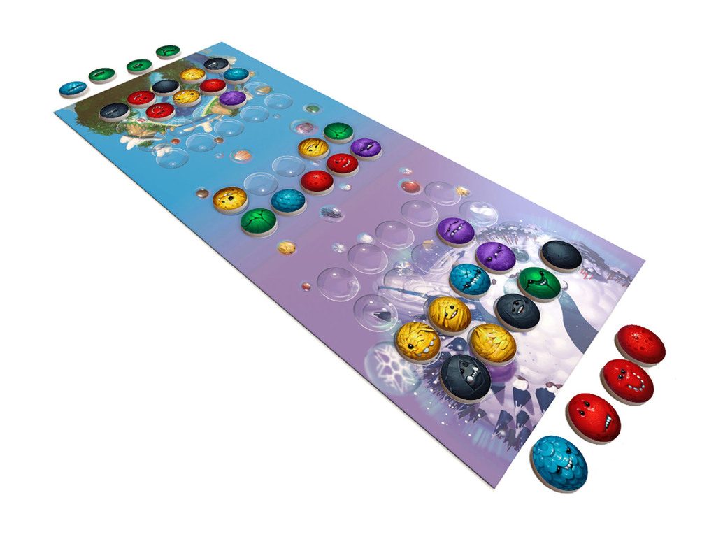 Bubblee Pop is 2-player game out of France, that is best described as an analog version of a head-to-head match 3 games that would expect on your smartphone. On a player’s turn, they will pick two, “bubblees” from the center of the board to fall from the sky in a straight line, you then look to see if you have 3 in a row/column of the same color that are lined up – if so – they “pop” (taken off board for scoring later). The twist here is that each color has its own power, to either allow you to manipulate your side of the board or to cause trouble for your opponent. Play goes until a player reached the top and cannot play a bubble or if all the bubblees are gone from the draw bag. If you like games were your go head-to-head and enjoy the match 3 genre, this is a great analog version of that, and ended up being one our favorite new releases we played in 2016. There is also solo player challenges in the rulebook, though I haven’t tried any of them.