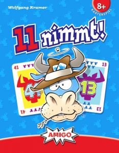 Many readers may have heard of the classic filler 6 Nimmt! (sometimes called Category 5 or Take 6), well 11 Nimtt is designed by the same designer and part of the Nimtt family of games. However, I will say that I enjoy 11 Nimtt much better that it’s classic big brother, 6 Nimtt. Cards are numbered 1-100 and have different numbers of oxen heads (which are bad and you don’t want to be stuck with). Players stack cards in a single pile by playing a card that is no more than 10 points higher than the card currently on top of the playing pile.. If you can’t (or don’t want to) play – you have to pick up the pile and then start two piles! So piles will grow in the game (but so can your hand), giving you more options. However, the twist is any time you take a stack with 3 or more cards you can get a bull card – which allows you play an extra card from your hand, the more bulls you have, the more cards you can play. The object is the first one to get rid of all of their cards. All other players take minus points for each oxen head that appears on the cards they are left holding and a new round starts. You play the number of rounds as there are players in the game – winner is the one with the least amount of minus points. Note if you do get a copy of this game, you will need to print out a copy of the English rules from Board Game Geek.