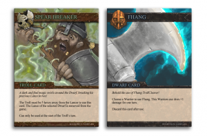 Troll Feet and Great Lances. ‘Nuff said! ….A lot of people don’t truly understand Dwarves of Iron Peak until you play the Troll and you are literally destroying and crushing your opponents dwarves in one hit as you simple walk across your cave floor (which is already littered with dwarf parts, the board art is not done!). Until you play the Dwarves you don’t realize how FUN it is to pin the nasty Troll players feet to the ground and prance around him stealing his precious Relic and stabbing at him (He Regenerates so be careful!). The Cave Spiders are also a lot of fun because they are a huge annoyance to the Dwarf player with their in-and-out tactics to poison and then run away, ready to poison another dwarf on the next turn.