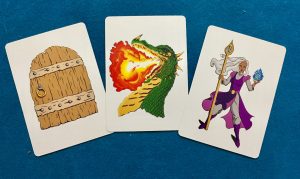 deck, trying to slap certain cards so they may grow their deck. The player to have all of the playable cards in their “army” wins Card Castle. The game consists of a deck of cards made up of seven different types, four of the seven types of cards make up each player’s army: Swordswomen, archers, knights, and shield cards. These army cards are used “attack” your opponent. There are also two card types which you are trying to slap: doors, and wizards. Finally, there is a dragon card, which messes with the cards armies will win when attacking.