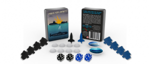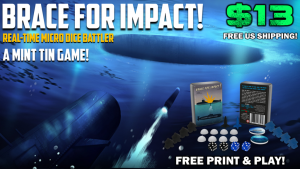 Brace for Impact! is a frantic, intense, head-to-head dice battler that plays in less than 5 minutes! You are a submarine Commander trying to either wipe out your enemy’s submarine crew or gather enough vital intelligence to be victorious! Commanders roll dice in real-time hoping to attain a 7 or doubles so that they can either stack their crew, load and fire torpedoes, drop depth charges, surface and dive, or gathering intelligence. The dice and real-time rolling adds an element luck, while the choice of surface or dive add an element of strategy and press-your-luck factor. Brace for Impact! is a portable micro dice game that can fit in your pocket and comes in a mint tin!