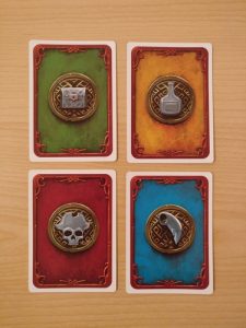 I often go searching for certain cards, Relics (blue back) are desirable if you have a lot of them, otherwise they’re negative points. Chests (green back) are also good, but sometimes can have really bizarre effects. Rum is always good (yellow back), except when it’s Fake Rum! Why’s all the rum gone? Oh wait, here’s one *swigs* that ain’t rum! Pirates are the last card type (red back) and are used during the 3 boarding actions where players compare pirate strength to their neighbors.