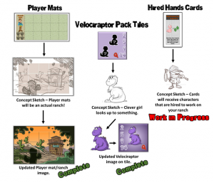 We have been lucky enough to have the funds to launch our last two campaigns with complete art but this was not always the case. Our first mainstream game, Dino Dude Ranch, was our first big project that required a lot of well-done art. We did not have the start-up to invest in all of it at the time, so we did as much as we could. I even asked my wife for more art for the game instead of a birthday present that year. I purchased art in pieces, so I created a section on my campaign page that I updated as art progressed. I shared concept sketches with backers and if new pieces came in, I would share those as well. Here is a quick example of how I handled it: