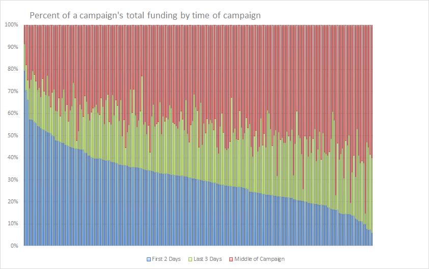 This chart shows all the campaigns in a stacked bar chart by the percentage of the campaign’s funding based on the three categories: first two days, middle of the campaign and final three days.