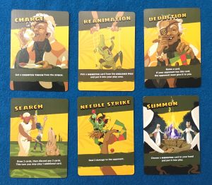 Players will take turns playing spells and monsters on their turns, trying to reduce the amount of life tokens their opponent has to zero. Players do possess two counter tokens from the start of the game, and may use these to counter an opponent’s card just played. This comes in handy when an opponent plays a card which may kill you, because you candiscard a token to counter the card, canceling its effects. However, the opponent may in turn counter your counter by spending two counter tokens in response to your one. There are cards in the deck which allow a player to earn counter tokens back, but these cards are few and far between, so choosing when to spend counter tokens is a vital part of the game.