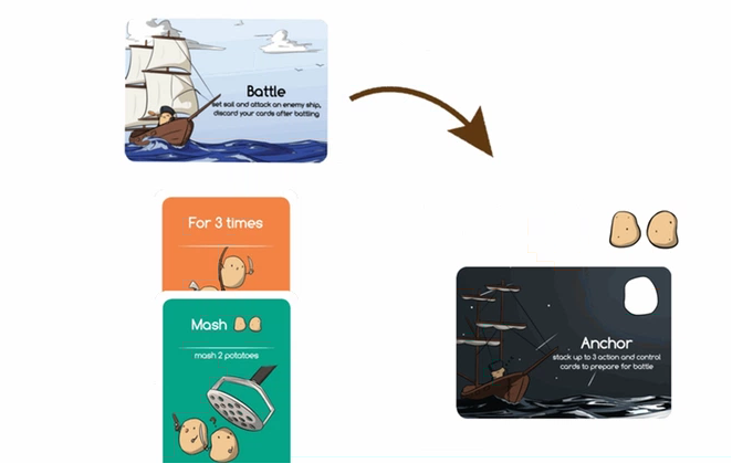 The pirate ships are double sided cards. On one side is the “anchored” side. The other side is the “battle” side reflecting a ship out to sea. While anchored, a player can “program” their ships and then set them out to sea for battle. To start, both ships are anchored and players assign some number of their potato crew tokens to each ship.