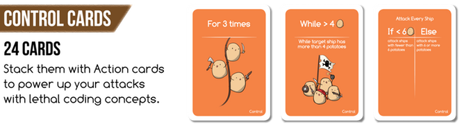 To program a ship, players can use up to three programming cards from their hand to their ship. On the bottom an “action” card that causes something to happen to your opponents ships such as frying or mashing opposing crew members. These cards are teal. Above that, up to two additional “control” cards are played. Control cards are orange and have common programming constructs like “while” and “for” loops and “if then” conditionals. When players send their ships to attack, these programming cards are evaluated top to bottom. For instance, in the example to the right, the player would “three times” mash two of their opponents potatoes. If, as is the case here, the other player doesn’t have enough potato crew members, the opponent’s ship is sunk.