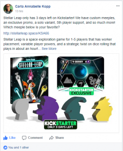 Carla: Each day, I check BGG, try to post somewhere relevant, check Facebook, post something on my personal page, either post on the Weird Giraffe Games page or have a scheduled post or two, post in a Facebook group about stretch goals, promotions, or whatever new thing I can, post about the campaign on twitter, respond to all twitter mentions, facebook comments and messages, emails, and BGG posts that I can, check all my slack channels, send messages to new and canceled backers as they come in, respond to Kickstarter comments, and send at least two personal messages to people that I think would be interested in Stellar Leap.