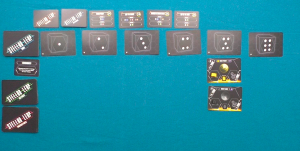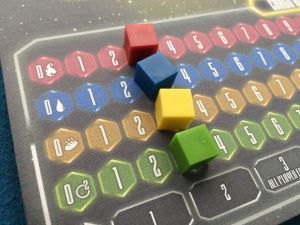 The game area is the galaxy in which players are performing the actions which fall under the “4X” categories. The galaxy is set with dice cards leading the columns, and rows made up of Solar Systems. Players begin with their species on their home planet but slowly grow and expand throughout space.