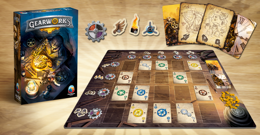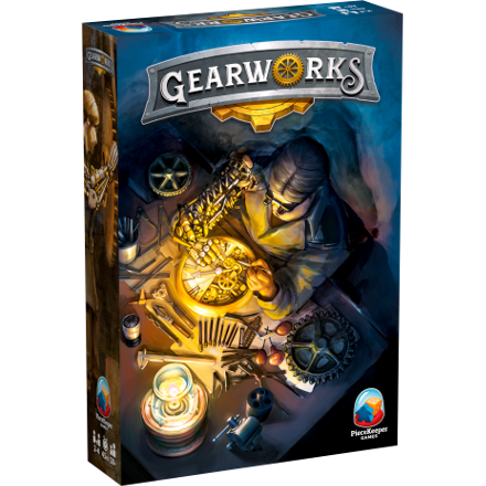 In Gearworks, you are tinkerers in a workshop fixing a broken clockwork machine. You compete to earn parts created by the machine each round and use those parts to build steampunk contraptions. It plays in 30-45 min for 2-4 players, ages 10 and up.