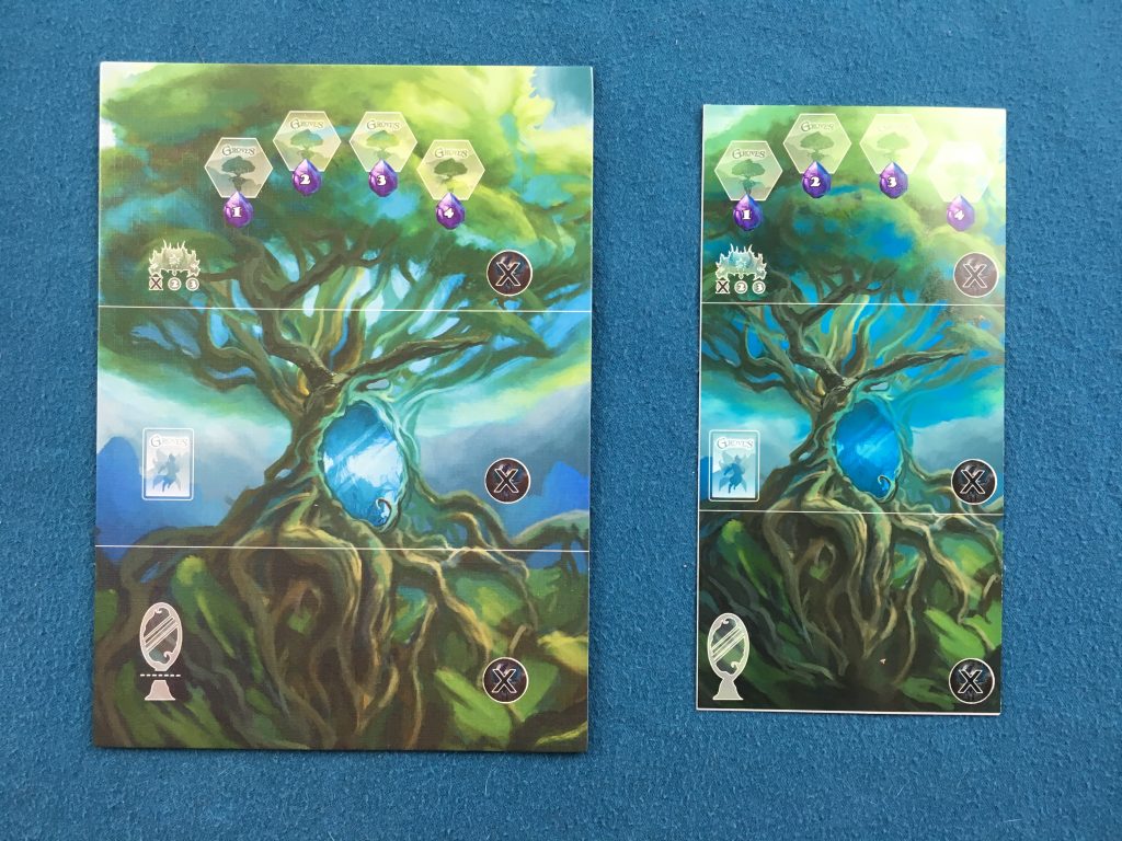 First, the Tree of Idyll. In the photo on right, the board on the right is the prototype version of the tree. Much smaller, and while difficult to tell in the photo, it is a thinner, glossy paper. On the left is the new Tree of Idyll. The tree just looks much more glorious and important.