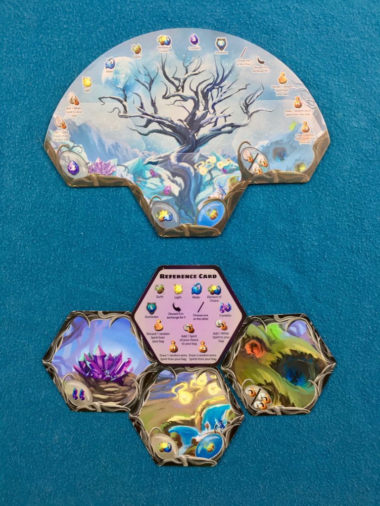 Next are the Player Boards. Originally, these boards were glossy hex cards, but they have since been upgraded to punchboard and have been rearranged into one single board. The reference card now runs across the upper border, and the resource cards are now along the bottom of the board. In addition, each Player Board shows the Tree of Idyll in a different season. Here on the right is the winter Tree of Idyll.