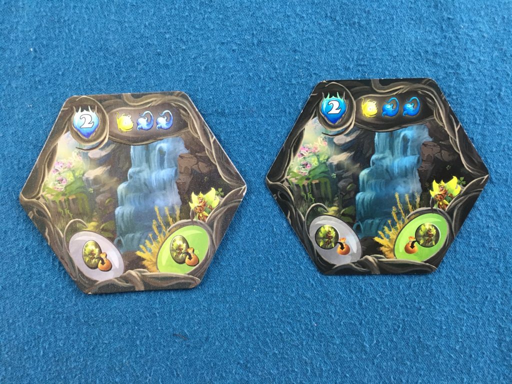 Let’s check out the hex cards. The size is the same, but the sturdiness has upgraded from thin gloss to punchboard matte. In the photo, the hex card on the left is the new card, and the one on the right is the prototype card.