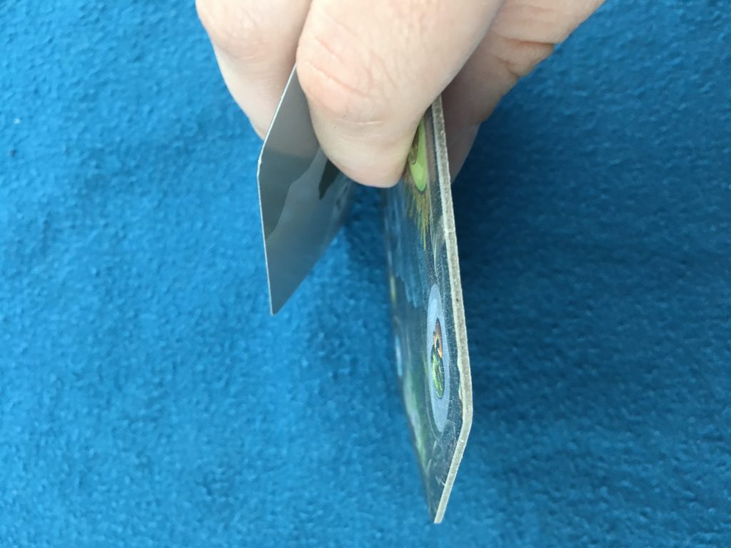 The Bonus cards were upgraded from white-core to black-core. Aaaannndddd I have no idea what that means, but I can say the cards used to feel more…Soft? I mean they weren’t soft, to begin with, but the new cards just feel tougher. They feel like they have a better recovery if they’re bent during shuffling. They also feel more like satin, when they used to feel slicker from the gloss coating. The top row, in the photo, are the new cards, while the bottom row are the prototype cards.