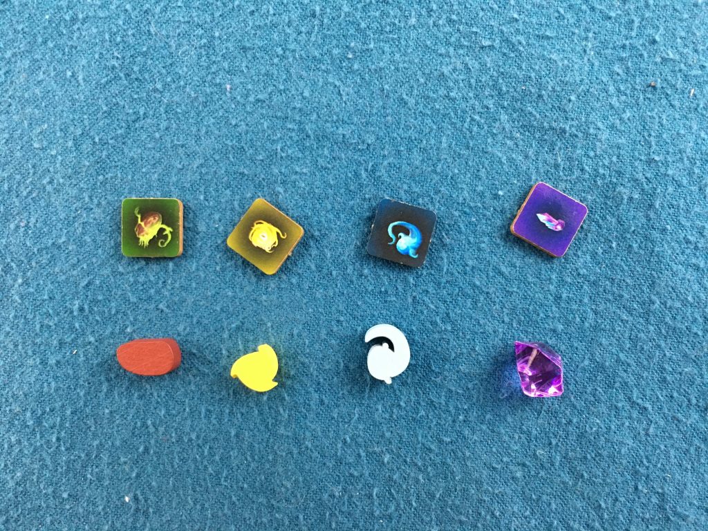 Moving along to some of the other components, we’re going to see some cool changes to pieces that I really like. The resource tokens have upgraded from glossy punchboard to acrylic gems and wooden tokens. Very neat, and honestly much easier to identify.