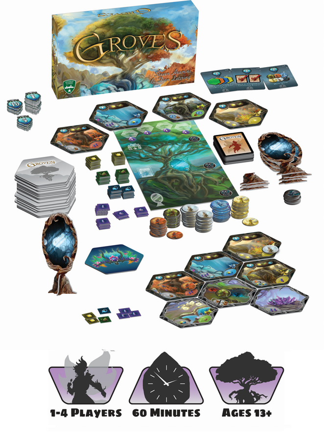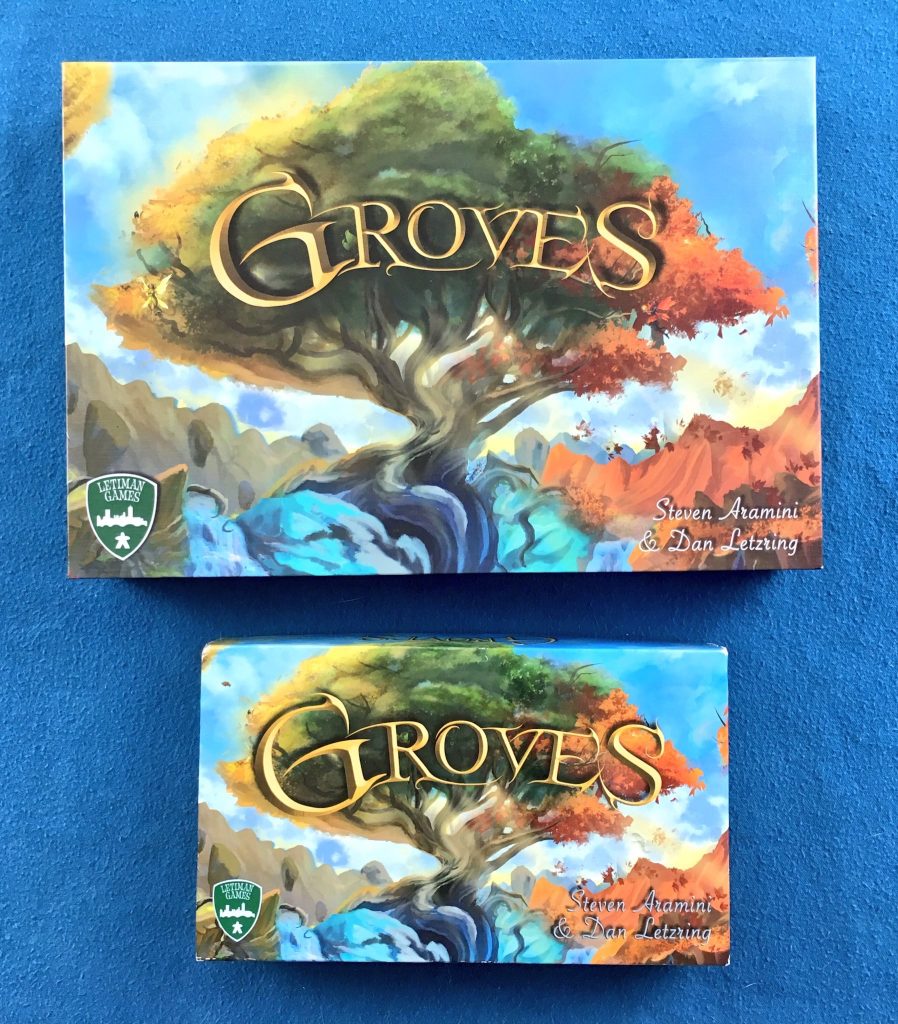 Groves is a beautiful game designed by Steven Aramini and Dan Letzring, with artwork by Nolan Nasser, and published by Letiman Games. Groves had a very successful Kickstarter campaign, reaching a funding amount of $38,123 (433% of its goal) and 957 backers. This game recently began fulfillment to its Kickstarter backers, including me! I was lucky enough to own one of the prototype copies of this game and super stoked to compare it to the final production copy. Now that I have both in my possession, I can do just that! Without further ado, Before and After: Groves edition.