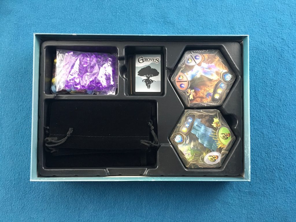 Now let’s check out the components and the upgrades they received through the Kickstarter campaign. One of the main upgrades which many of the components in Groves received is upgrading from thin glossy paper to punchboard.