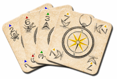 Steven: I had decided I really wanted the theme to be nautical/age of sail, and so I was trying to think of what purpose the suited cards should play in the game and why players should care about winning the trick. Being a pick-up and deliver, as well, it became clear that the most important thing in the game was to be able to navigate efficiently and beat your opponents to the best goods. Thematically I liked that you had eight sailing directions, so that dictated my values of 1-8. And then when I started putting limitations on sailing directions (i.e. a “2” value allows you to sail in two directions), it really became a fun puzzle of deciding how to navigate the seas.