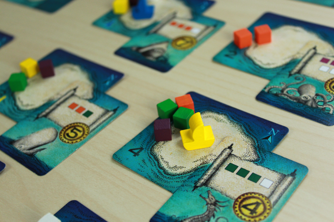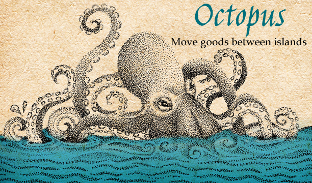 Steven: The sea monsters were not part of The Game Crafter contest entry because I didn’t have enough budget (we were given a budget restriction as part of the contest rules) to include them, but I always wanted actual sea monsters and Andrew was on the same wavelength so we added them to the game really early in the development. The sea monsters give players the ability to manipulate the goods on the island in unique ways based on their powers. We worked really hard to not only balance their powers but also give them powers that were thematically appropriate. For example, the giant octopus with its long arms has the ability to steal a good from an adjacent island. And the player that activates the monster is the one who plays the LOWEST on-suit card during the trick phase. This adds a new layer of strategy as players struggle to decide if they want to try and win the trick to sail first or lose the trick but get to command the monster.