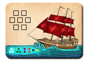 Steven: It mashes together two classic mechanics – trick-taking and pick-up and deliver. The first phase has each player playing a navigation card from their hand and comparing them, with the winner of the trick getting to be the new leader and sailing first. The second phase has players visiting islands to pick up goods or deliver them to fulfill orders, which earn you gold (the victory points in the game).