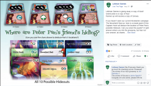 Once we determined that we were ok with just barely funding, we had to decide on how we were going to make funding happen. We examined our campaign page, reached out to colleagues and potential backers, and tried to determine where we went wrong and how we were going to address the problems. Although there are a handful of missteps that I feel I made in the campaign/marketing strategy, I felt out two biggest issues were 1) not enough eyes were on the campaign and 2) the gameplay itself was not connecting with potential backers. We tried to address both of these problems with the same solution. For us, the most interesting part of The Neverland Rescue is the deduction that Hook has to do during the game. Peter Pan has 5 secret hideouts (out of a possible 10) and Hook has to guess which 5 Pan has based on clues received in game. We wanted to share how much fun this is, so we created an image that contained some of the clues Hook receives in game and we asked people to perform the deduction and guess what Pan’s 5 secret hideouts are! In order to incentivize people actually looking at it and getting involved, we offered anyone who made guesses an entry into a giveaway for one of this year’s Spiel des Jahres nominee Azul. Azul is very hot right now because of this and we knew the giveaway would get engagement. Once people got immersed in the puzzle, this felt like a surefire way to not only give examples of gameplay but to share the feelings experienced in game with everyone.