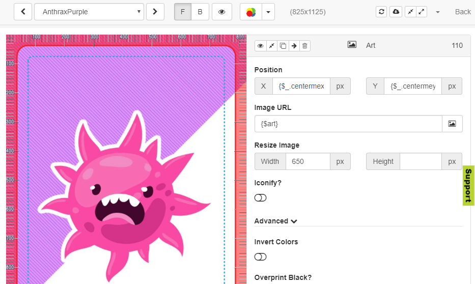 In this case, I use the data set column “{$art}” for the Image URL. This column resolves to the variable which stored the location of the relevant art file. You’ll notice that there isn’t a special purple version of this art. If you look at the data set, the same “image source” is used regardless of the color of the card. As a result, you’ll see the regular, full-color version of the art.