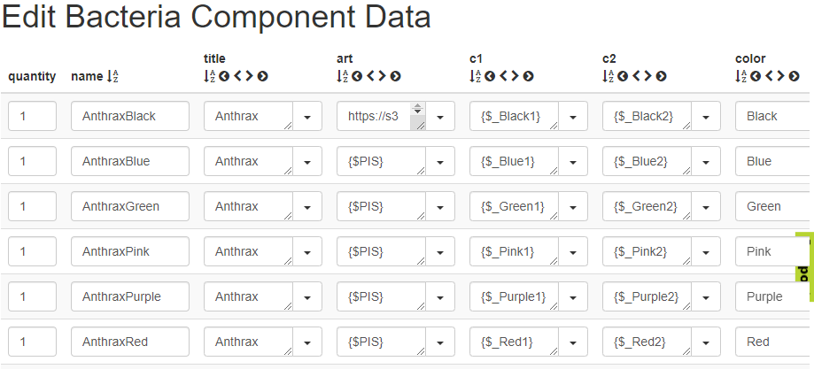 The relevant trick, however, is that I used my columns “c1” and “c2” for primary and secondary colors in combination with a “hatch” fill. For “purple”, those values for the Anthrax cards in my data set are “{$_Purple1}” and “{$_Purple2}”. The values then resolved to their HTML values that were entered into the data set variables for Purple_1 and Purple_2. If I needed to adjust the primary and secondary colors, then, I would just adjust them in the variables. Those values would propagate to every purple card.