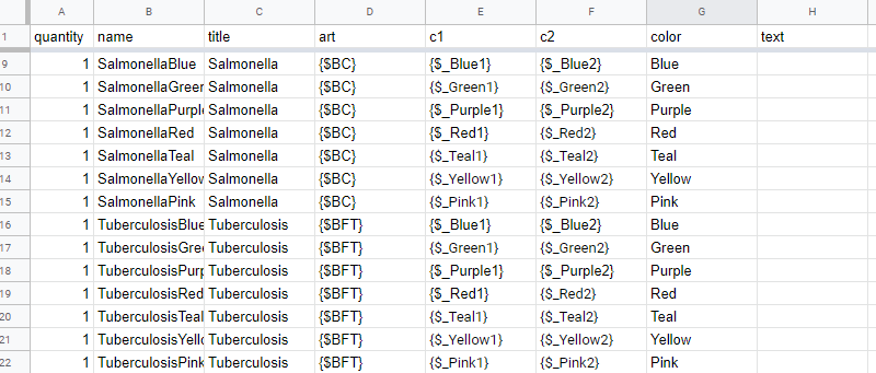 Here’s where I start to use variables: for the “art” and the two color values. Copying the names from the “Variables” above, I plunked them down into the relevant columns.