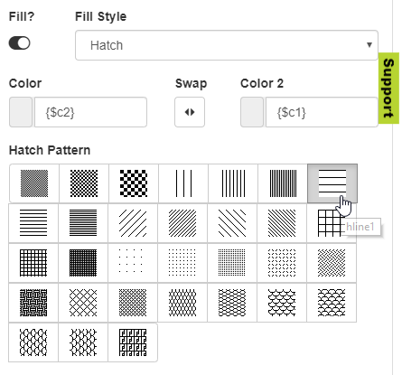More importantly, because the values for the primary and secondary colors are coming from the rows on the spreadsheet, I don’t need any special logic to make the background change — note that one thing that would be nice is if I could easily change the hatch type by variable, but that doesn’t seem possible.